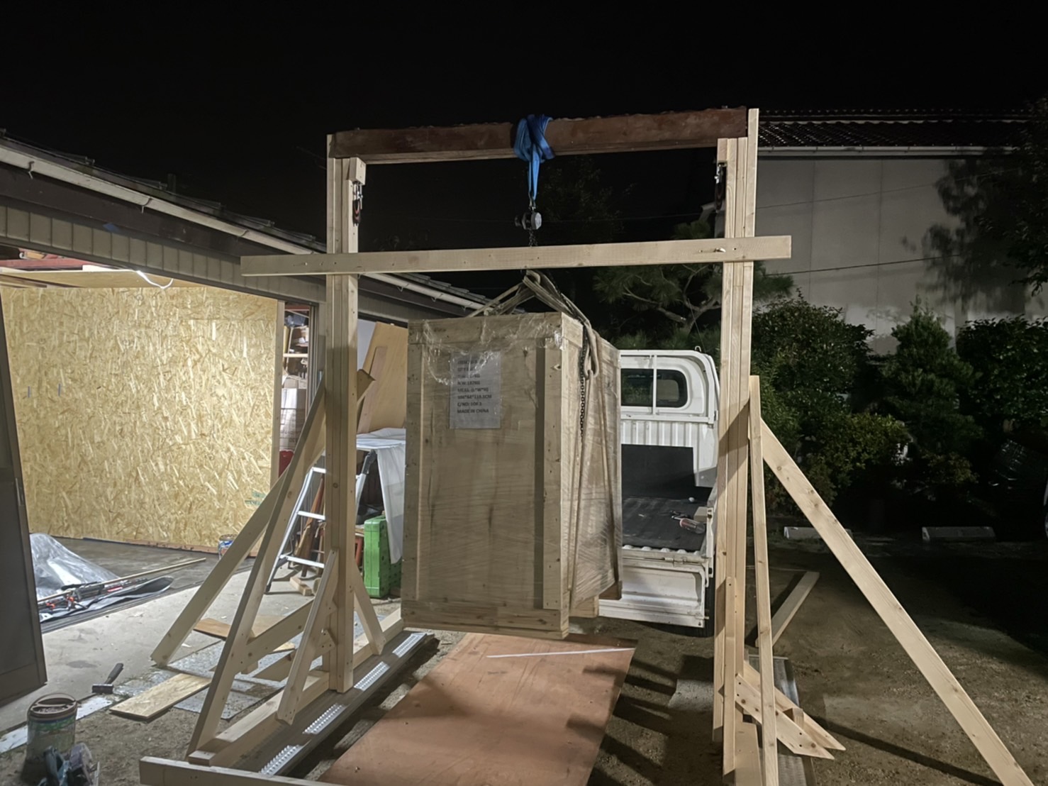 荷下ろしですがレーザー400キロの時はリースでユニック、CNC370キロの時は近所でユニック借りて、今回は200キロと軽量なので自作の門型に500キロのレバー(チェンブロはない)で吊っておろしました。