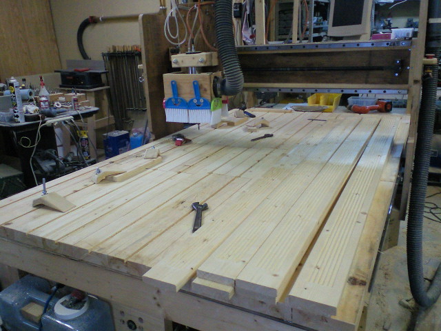しかたなく、120mm角の桧の柱を3枚におろし、Tslotを彫り全体に並べ面だし削りすることにした。